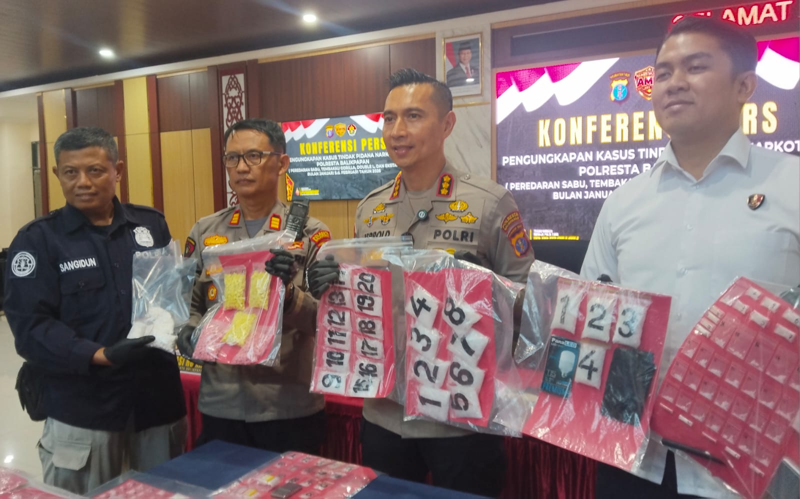 Kapolresta Balikpapan KBP Jerrold H. Y. Kumontoy, SIK, M.Si, menyampaikan, total barang bukti yang disita meliputi 1.079,01 gram sabu, 8,1 gram tembakau sintetis, 1.319 butir ekstasi, serta 1.000 butir obat Double L.
